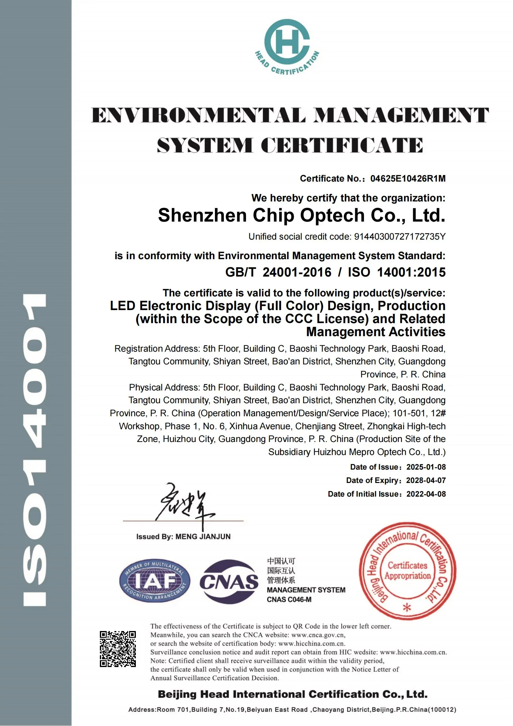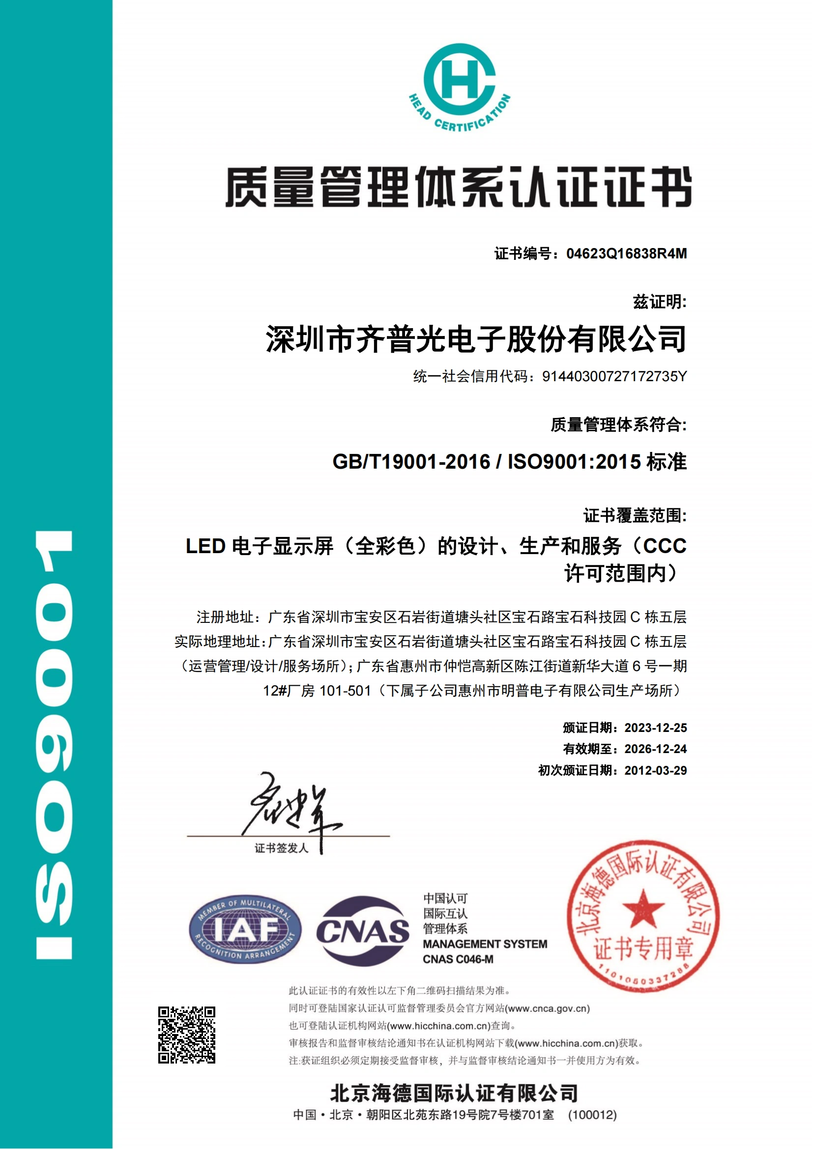 Company certified to ISO 9001:2015, ISO 14001:2015, ISO 45001:2018, and GB/T 29490-2013 (IP management).